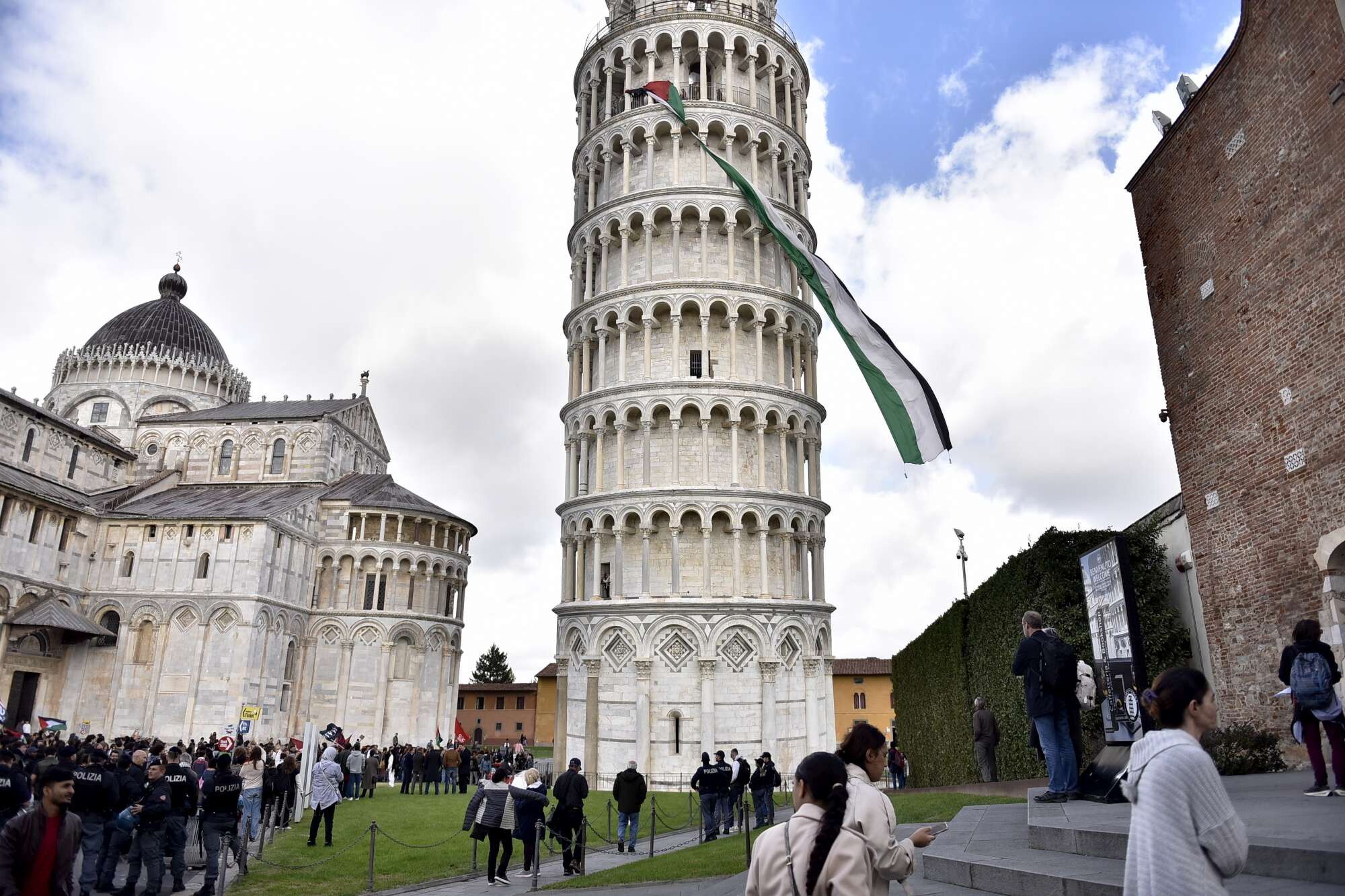 Blitz di una quindicina di studenti aderenti ai movimenti antagonisti che hanno fatto irruzione all'interno della Torre di Pisa, superando i controlli, e hanno esposto una maxi bandiera della Palestina dal campanile più famoso del mondo. Hanno anche acceso un paio di fumogeni prima di scendere. Non risultano danni. Secondo quanto ricostruito dalla questura, hanno agito al termine di un corteo pacifista composto da circa 500 persone che stamani ha attraversato le principali vie del centro fino a piazza dei Miracoli. Il blitz è durato pochi minuti e si è concluso in modo ordinato. La Digos e la polizia scientifica, attraverso i filmati, cercheranno di identificare gli autori, ma potrebbero essere denunciati solo se l'Opera Primaziale Pisana, che custodisce il patrimonio di piazza dei Miracoli, deciderà di sporgere querela per l'intrusione abusiva.