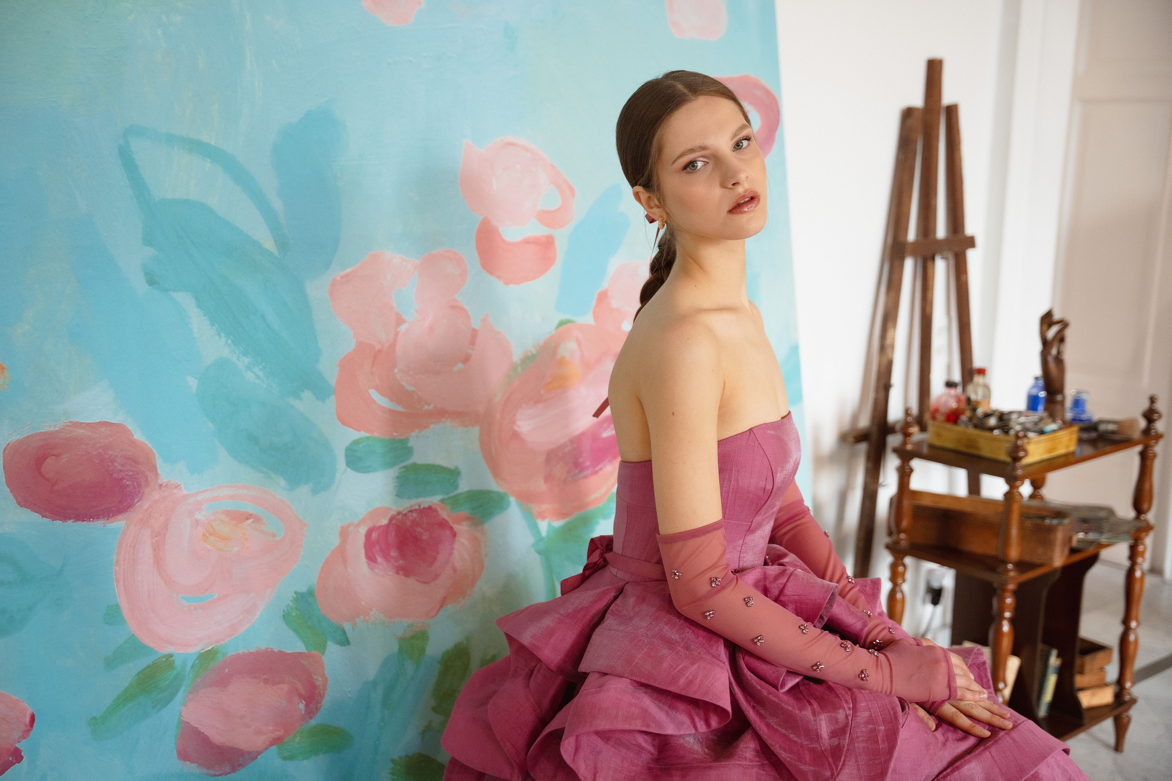 © Ufficio stampa|A fare da sfondo alla collezione Cerimonia primavera estate 2024 di Atelier Emé, la performance di Giulia Sollai, pittrice e illustratrice, che ha dipinto tele dal vivo