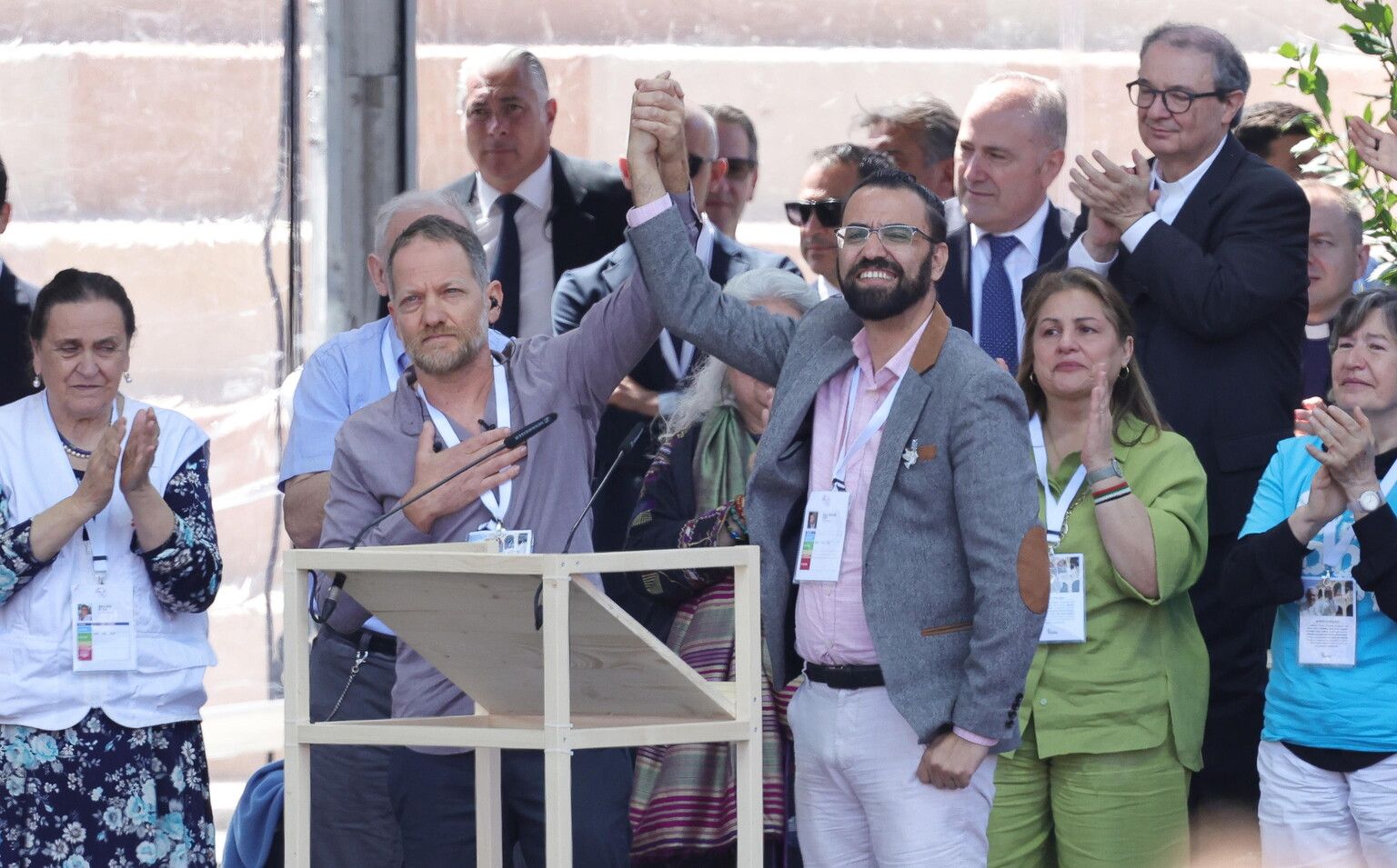 Papa Francesco, sul palco dell'Arena di Verona, ha salutato il discorso di pace pronunciato poco fa dai due familiari di vittime del conflitto dalla parte israeliana e da quella palestinese.