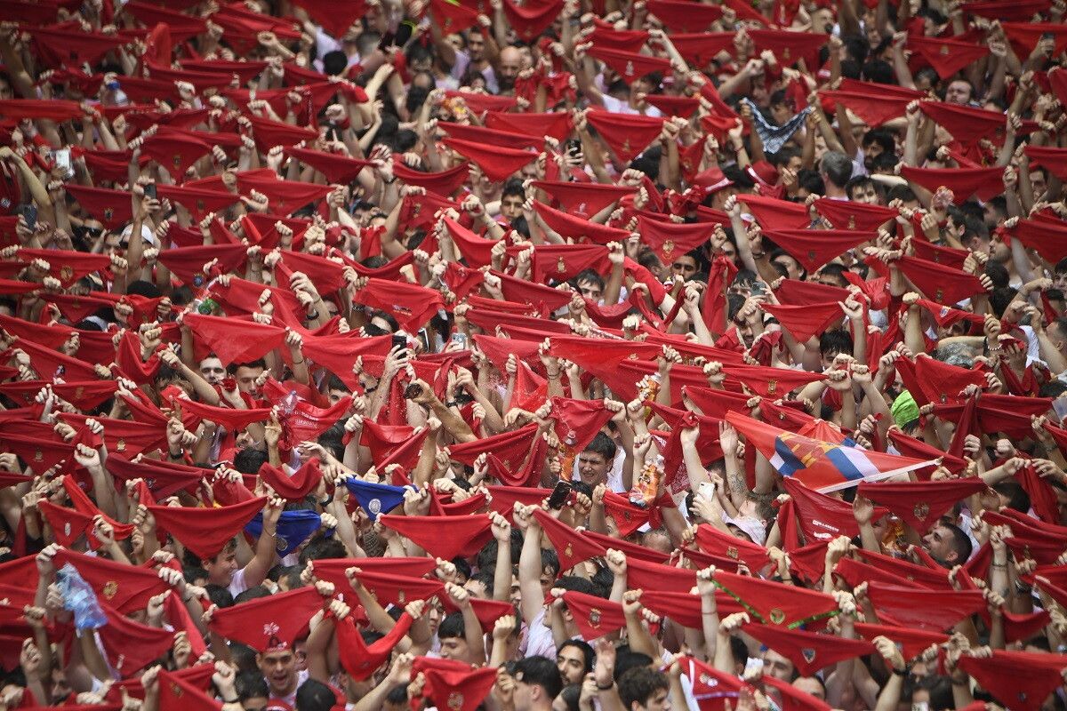 Piazza gremita di residenti e turisti, a Pamplona, nel nord della Spagna, per la tradizionale festa di San Fermino. Giovani, tra fiumi di alcol, si affollano per partecipare alla corsa davanti ai tori, sport pericoloso che appassiona anche i locali. Il bianco e il rosso sono i colori tradizionali sfoggiati fin dalla prima giornata delle celebrazioni del santo.