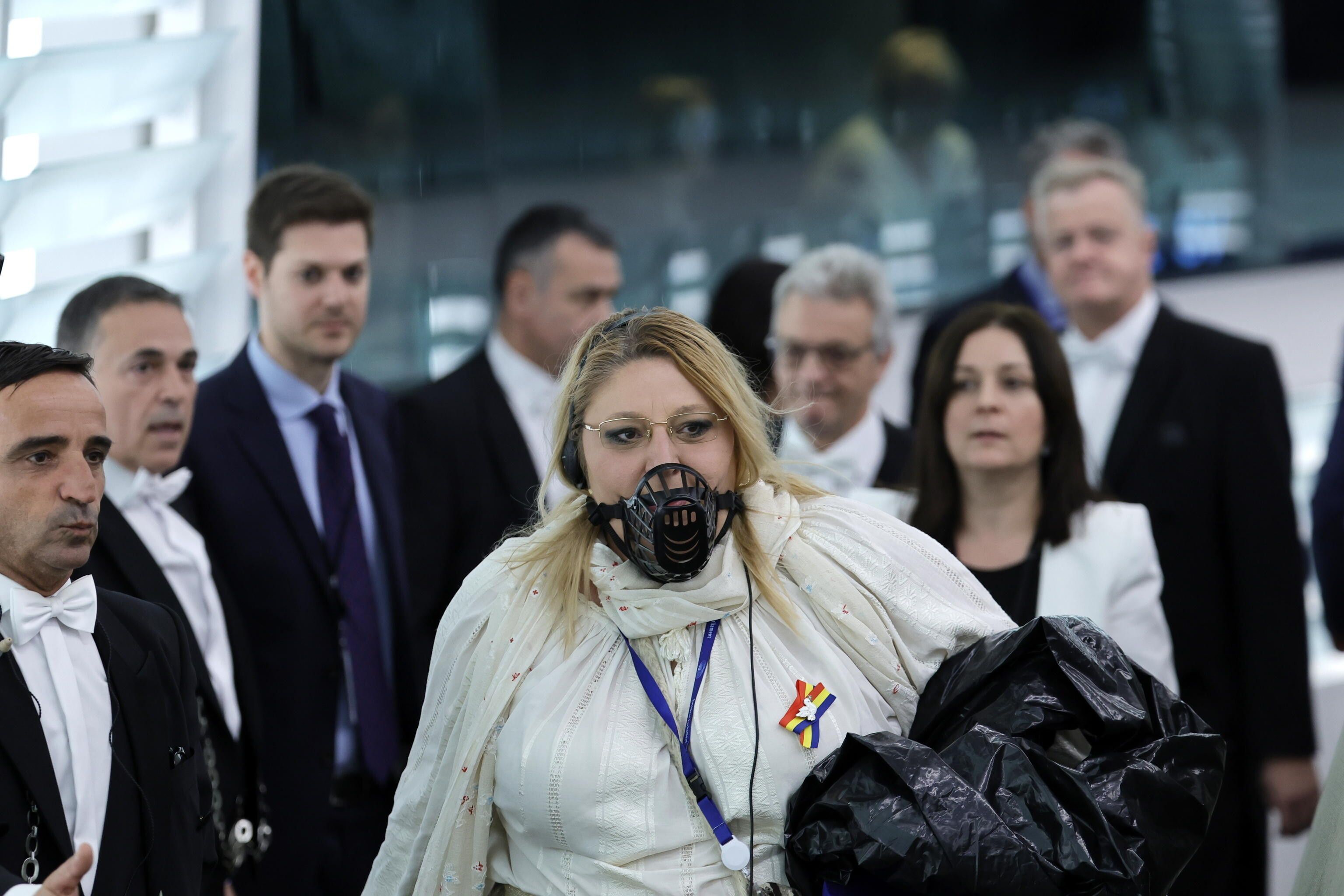 Diana Iovanovici Sosoaca, membro del partito di ultradestra Sos Romania, ha anche mostrato due icone sacre al grido di: "Noi crediamo in Dio", prima di essere accompagnata fuori dall'emiciclo di Strasburgo