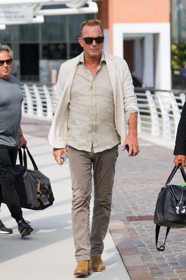 © Ufficio stampa|Kevin Costner in total look Falconeri per il suo arrivo all'aeroporto Marco Polo di Venezia (foto Getty Images, diritti PR Worldwide)