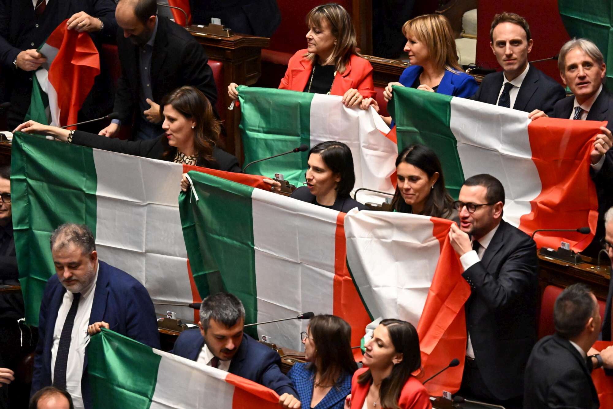 Scatta la bagarre in Aula, con le opposizioni che sventolano bandiere tricolori e cantano l'inno di Mameli. Qualcuno ha gridato anche "vergogna", criticando il governo