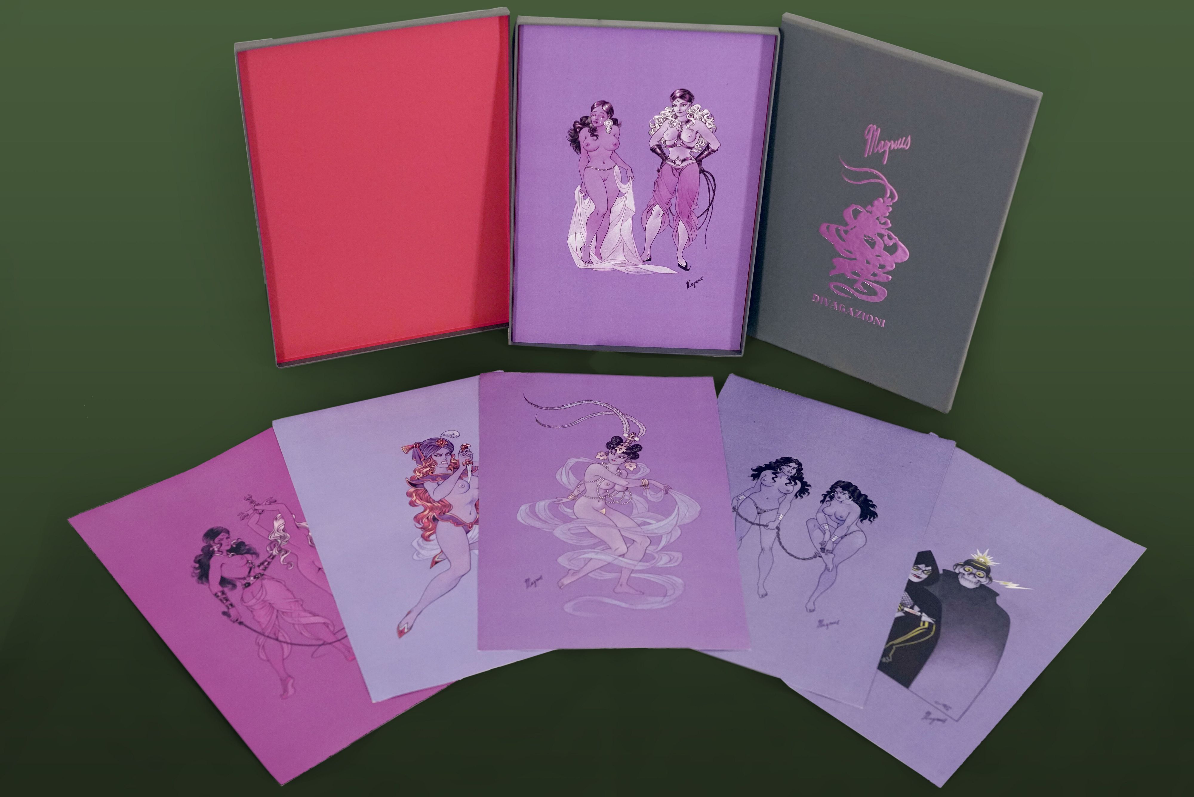 Sei disegni inediti e cinque studi preparatori su pregiate carte colorate del maestro del fumetto Roberto Raviola, in arte Magnus (Bologna 1939 – Imola 1996). È un vero e proprio tesoro ritrovato il portfolio “Divagazioni”, che la giovane casa editrice bolognese 9970 pubblica in una elegante “Artist Edition” in cofanetto di grande formato (30 x 45 cm) e in tiratura limitata di 250 copie.