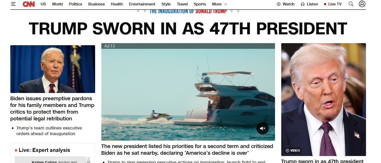 La cerimonia di insediamento di Donald Trump alla Casa Bianca come 47esimo presidente Usa occupa le aperture dei siti di tutto il mondo. "Trump si descrive come 'salvato da Dio'", sintetizza il britannico Guardian, mentre Bbc sottolinea come il nuovo presidente abbia promesso "una nuova età dell'oro dopo il giuramento".