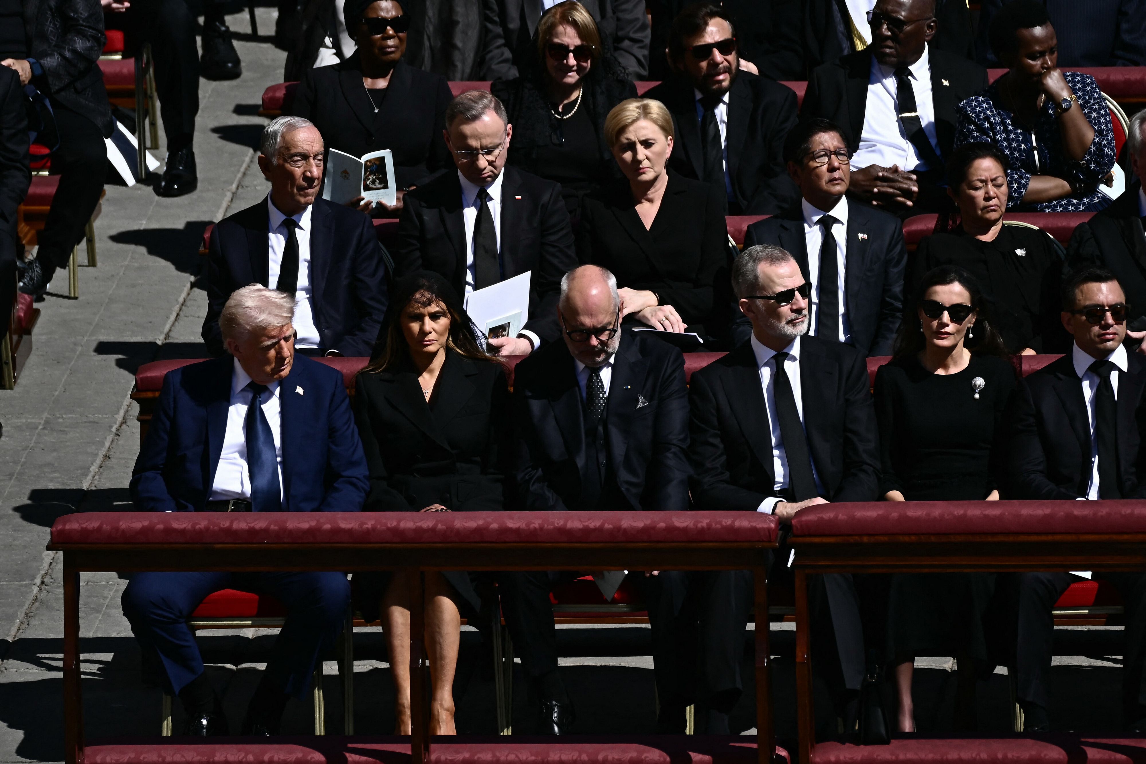 Sul sagrato di San Pietro per i funerali di Papa Francesco il presidente degli Stati Uniti Donald Trump siede in prima fila con la moglie Melania; vicino ci sono il re Felipe VI di Spagna e la regina Letizia. Poco più a sinistra, sempre in prima fila, il presidente francese Emmanuel Macron con la moglie Brigitte. Sempre in prima fila ma dalla parte opposta siede Zelensky con la consorte Olena. L'ordine dei posti segue l'alfabeto francese.