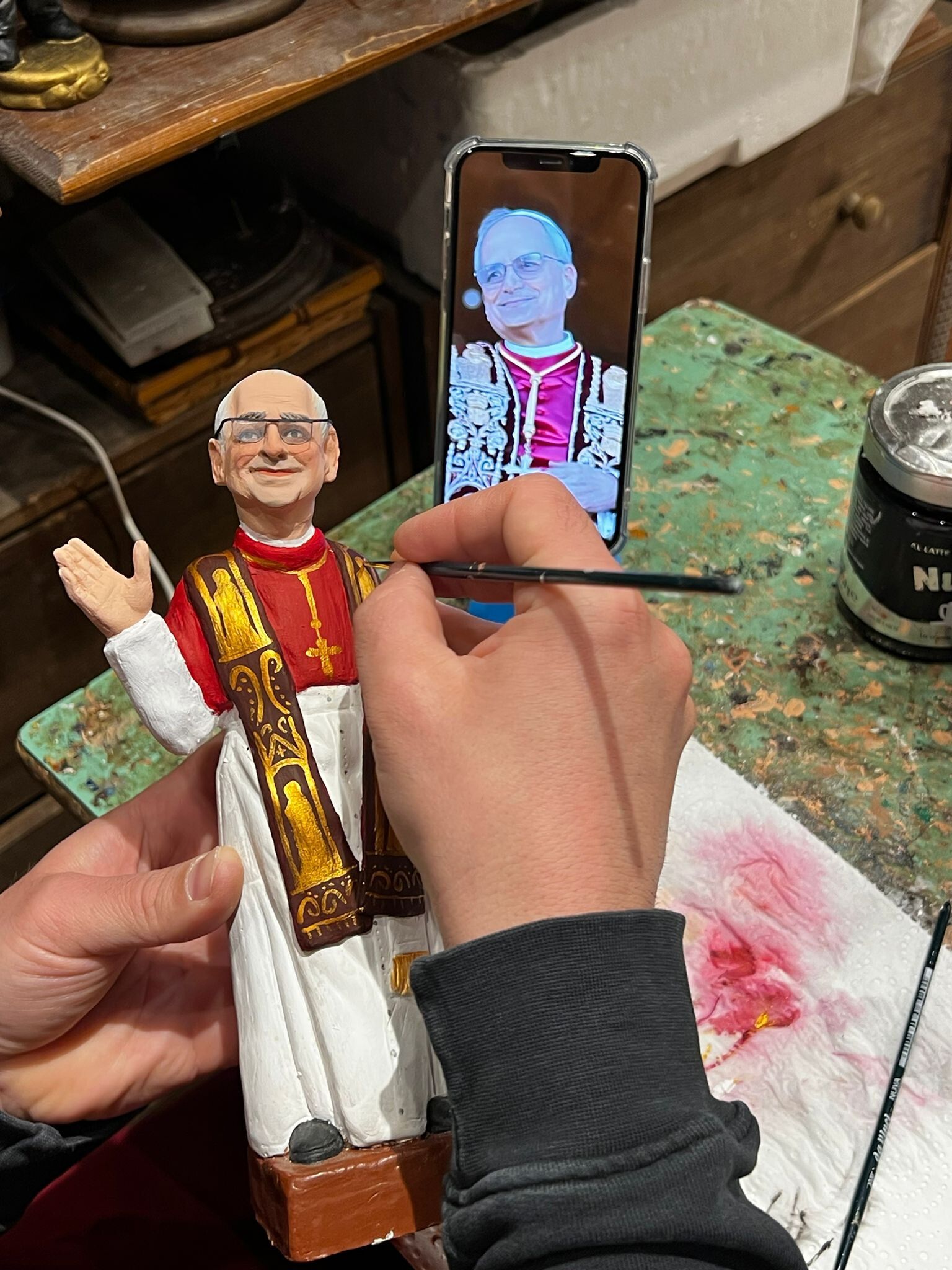 "Ho lavorato tutta la notte sulla statuina in terracotta - svela Genny Di Virgilio, artigiano del presepe napoletano di San Gregorio Armeno, - basandomi su una delle foto scattate dopo l'elezione, quando Il Papa, l'americano, sorride e saluta i fedeli". E' così che, in tempi record, Napoli celebra Leone XIV.