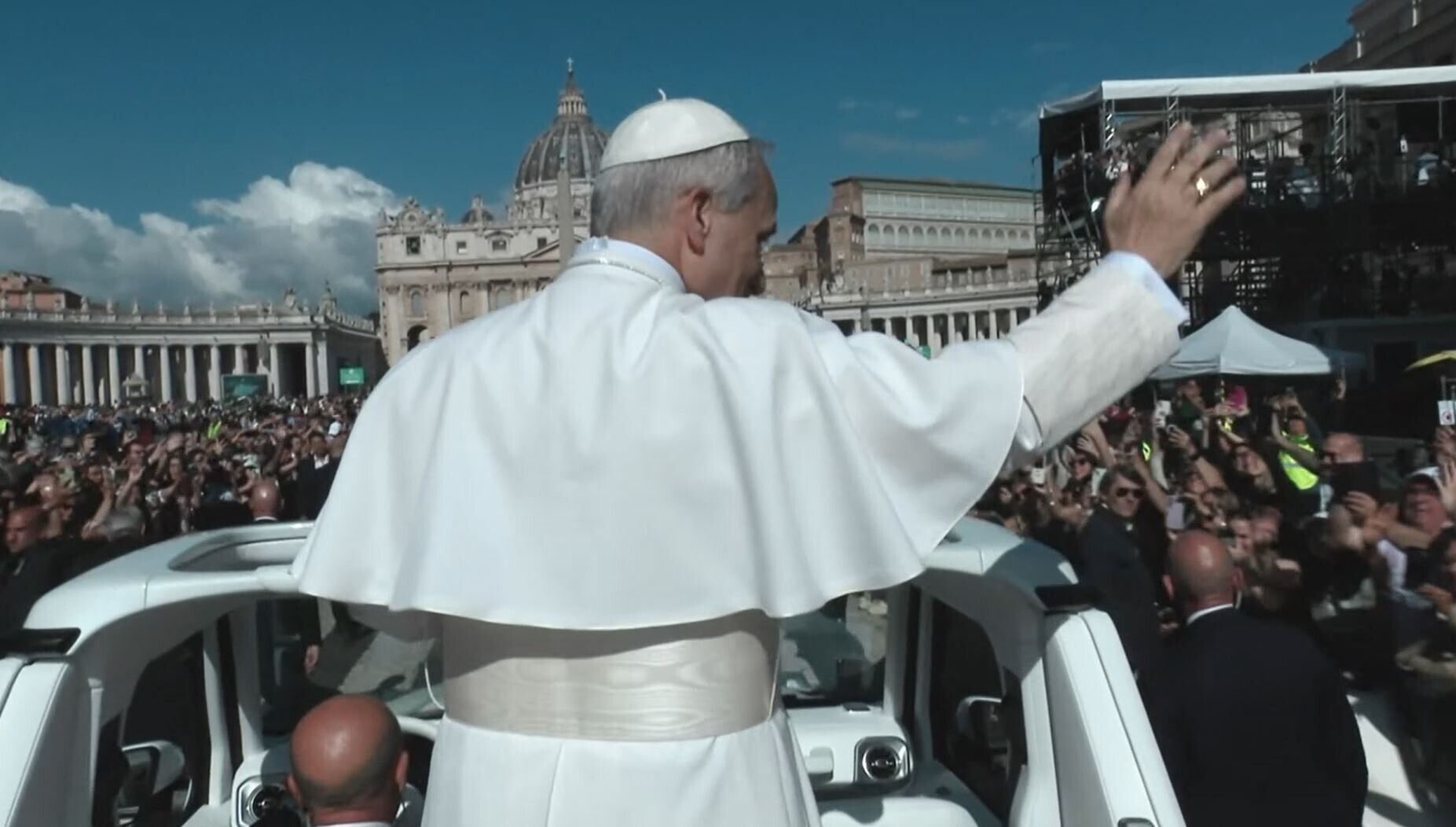 Alle 9:04 del 18 maggio 2025 Papa Leone XIV ha iniziato il suo primo giro sulla Papamobile in Piazza San Pietro. Prevost saluta i fedeli presenti che lo acclamano e lo applaudono. Sullo sfondo il suono delle campane a festa della Basilica.