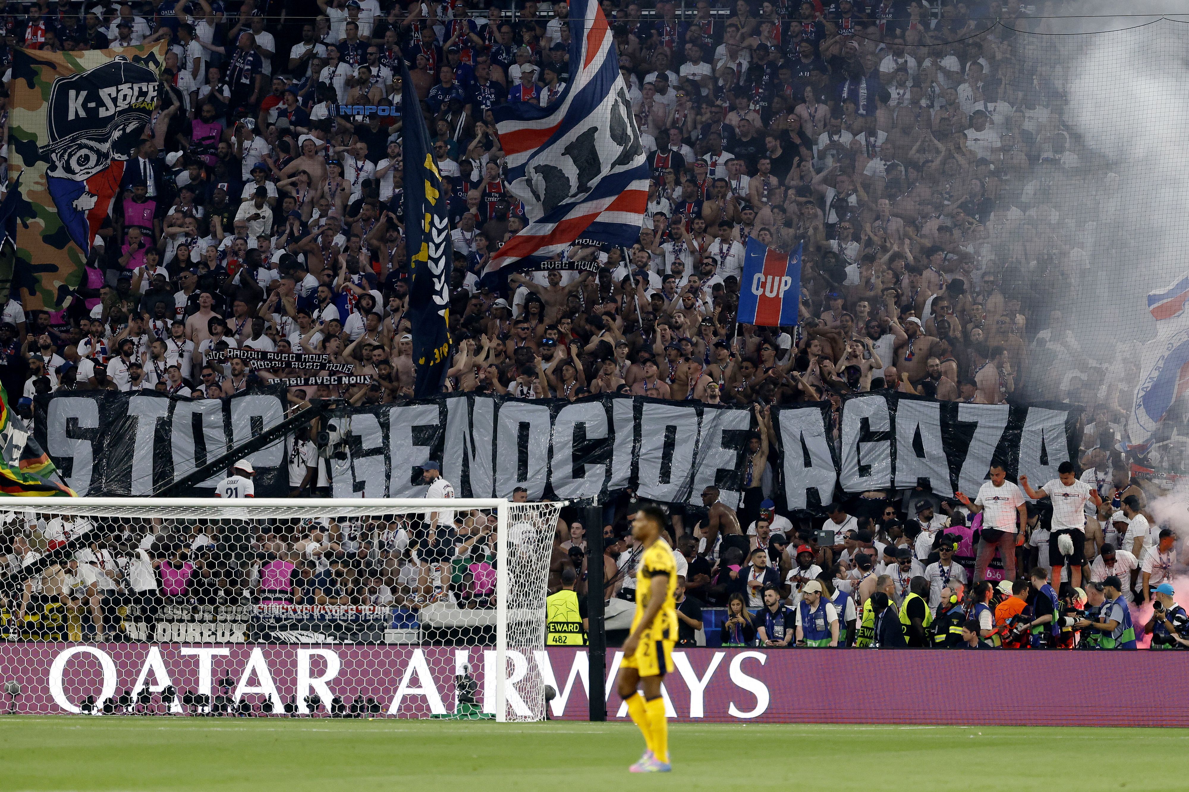 I tifosi del Paris Saint-Germain hanno esposto uno striscione con la scritta "Stop genocidio a Gaza" durante la finale di Champions League, poco dopo che Achraf Hakimi ha portato la squadra in vantaggio per 1-0 contro l'Inter, al 12° minuto. I tifosi del PSG sono noti per la loro posizione contro la guerra a Gaza: in precedenza, a novembre, avevano esposto un gigantesco striscione con la scritta "Liberate la Palestina" durante la partita di Champions League contro l'Atlético Madrid.