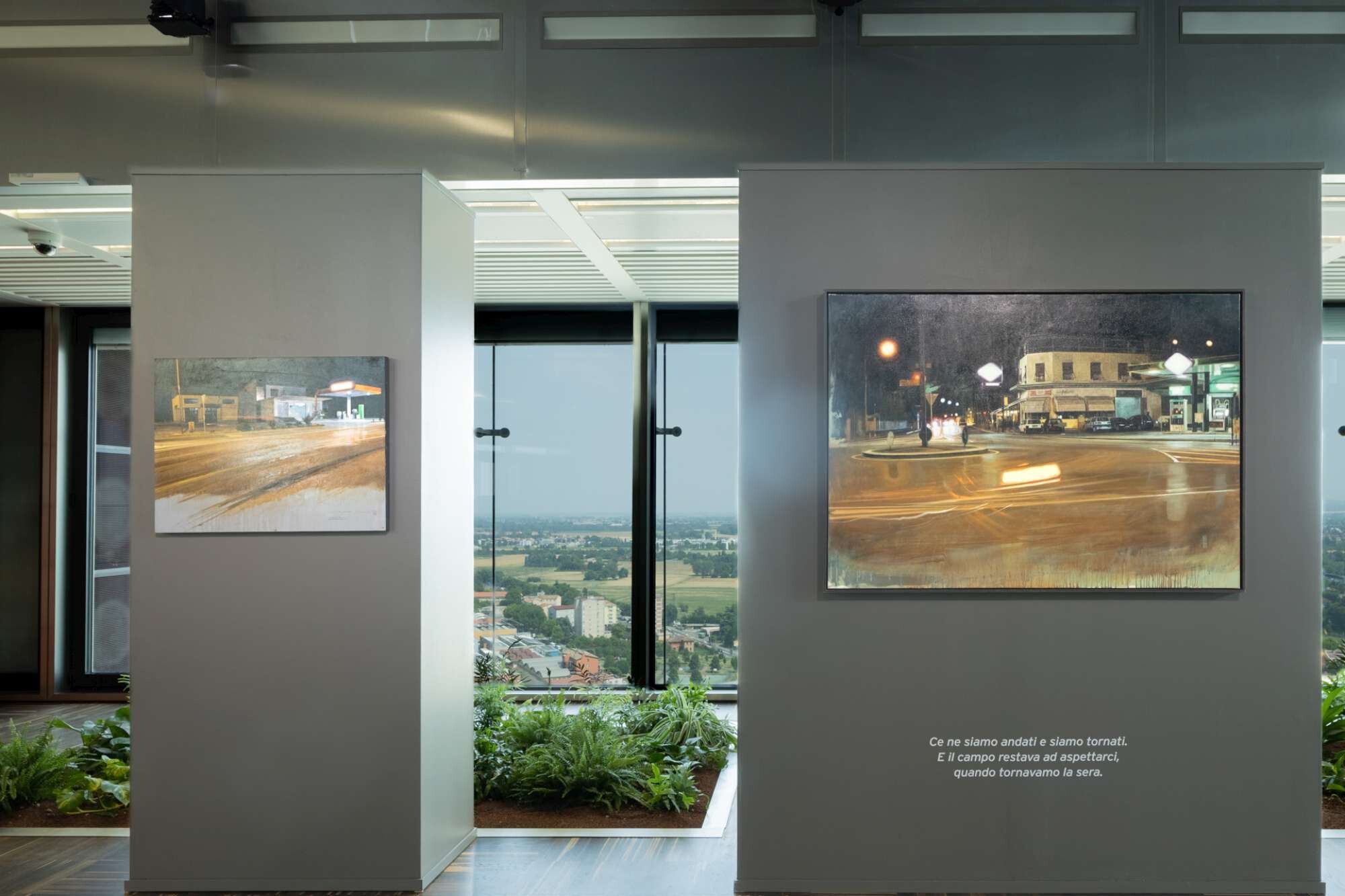 La serie dedicata ai paesaggi notturni di Nicola Nannini è ospitata dalla sede di CUBO in Torre Unipol. Quelli rappresentati sono ambienti sospesi tra luce e oscurità, tra ciò che è visibile e ciò che si perde nell’ombra. Il paesaggio diventa così un luogo di attesa e introspezione, dove la percezione si affina e il tempo sembra dilatarsi.