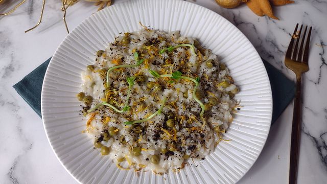 Polvere di limone nero: cospargere leggermente la superficie del risotto con la polvere di limone nero per un tocco aromatico e visivamente accattivante.