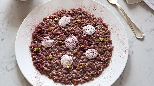 - Distribuite il risotto nei piatti, aggiungete la stracciatella, i pistacchi e una spolverata di polvere di ibisco.