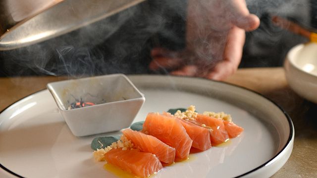 Condire con il crumble in superficie, guarnire con la salsa di yogurt alla spirulina e incendiare, infine, i trucioli di quercia.