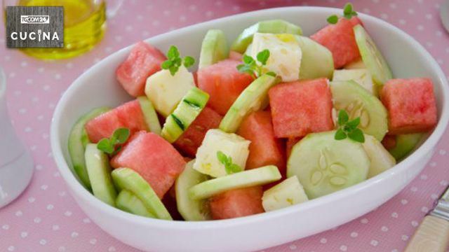Servite immediatamente l'insalata di anguria, cetrioli e pecorino.