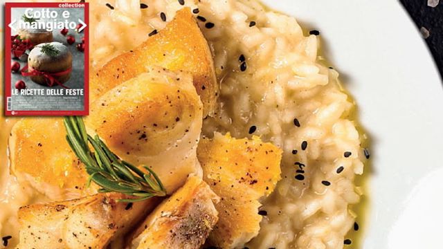Un primo piatto gourmet per chi ama il gusto deciso del pesce accolto dalla morbida dolcezza del riso. L'elemento scenografico sarà dato anche dalla decorazione a contrasto realizzata con i semi di sesamo nero e i rametti di rosmarino che contribuiranno a profumare delicatamente questa raffinata pietanza. Potrete trovare questa suggestione insieme a molte altre nel numero di Cotto e mangiato Collection con le "Ricette delle Feste".