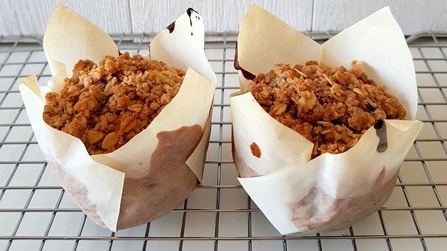 Versate un cucchiaio di farina sui mirtilli poi unite al composto mescolando delicatamente con una spatola. Riempite i pirottini con l’impasto per i muffins fino a 3/4. Cospargete lo streusel coprendo uniformemente tutti i muffins.