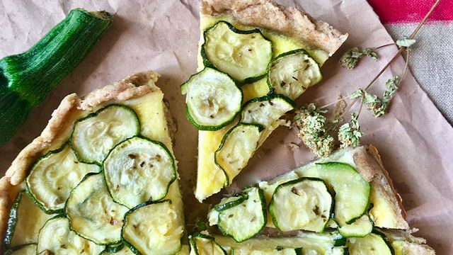 Togliete la quiche dal forno, distribuite le zucchine sulla superficie sovrapponendo leggermente le rondelle. Cospargete con origano a piacere e terminate la cottura in forno (circa 10 minuti).