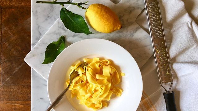 Prima di scolare la pasta, versate altri due mestolini (la pasta all’uovo assorbe i liquidi più di quella secca), mantecate in padella e prima di servire grattugiate la scorza fresca di mezzo limone.