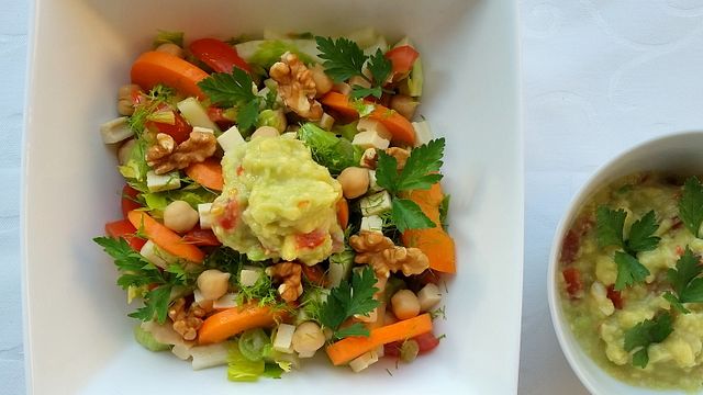 Condite e mescolate l'insalata poi servitela in una ciotola mettendo al centro due cucchiai di salsa di avocado.