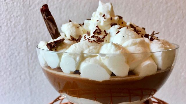 Componete le coppe alternando panna, mousse al cioccolato e ancora panna.