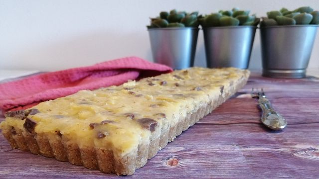 E’ capitato che avessi della crema pasticcera avanzata, l’ho arricchita di cioccolato al latte e l’ho messa a copertura di una base preparata con i digestive.