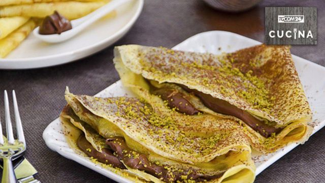 Farcite le crepes con un cucchiaio di Nutella, distribuendolo su una metà che poi richiuderete a portafoglio. Servite le crepes decorandole con granella di pistacchi, cacao o zucchero a velo.