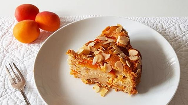Versate l’impasto in una teglia imburrata ed infarinata. Decorate la torta con albicocche tagliate a fettine e le mandorle sfilettate.