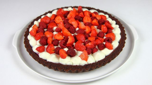 Per la decorazione, prendete la base della crostata dal frigorifero, sformatela e posizionatela su un piatto da portata.
