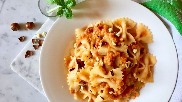 Scolate la pasta, condite con la salsa e aggiungete il trito di nocciole e pomodori secchi.