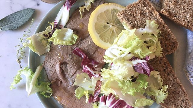 Aggiungete metà succo al roast-beef, poi timo, salvia, spicchio d’aglio, olio d’oliva abbondante e una spolverata di pepe nero (se piace).