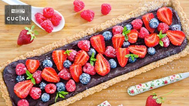 Farcite la base di pasta frolla con la ganache ormai fredda e spalmabile, decorate quindi con la frutta, la menta e poco zucchero a velo.