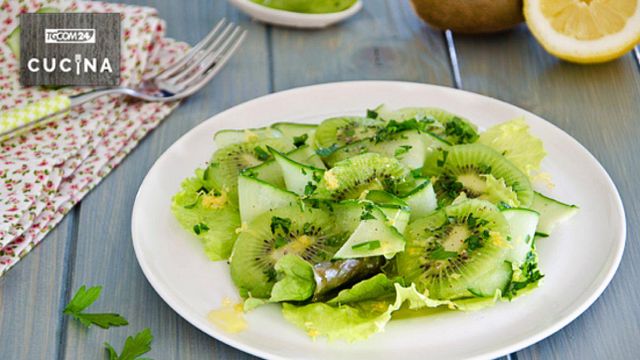 L'insalata di kiwi e cetrioli è un contorno insolito e gustoso che abbina fra loro ingredienti verdi, crudi e dal sapore delicato. Fresca ed estiva, l'insalata di kiwi e cetrioli si prepara in pochissimo tempo ed è condita con un'emulsione di olio e limone, scorza di limone e prezzemolo fresco. Potete riunire tutti gli ingredienti in una ciotola e condirli o fare come me e comporre il piatto posizionando singolarmente frutta e verdura!