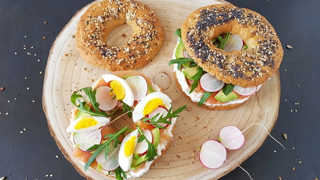 Appena i bagels si sono raffreddati tagliateli a metà e spalmate sulla base il formaggio poi adagiate le fette di salmone, la rucola, i ravanelli a fettine sottili, le uova sode tagliate a spicchi e l'avocado. Richiudete con l'altra metà del bagel e serviteli!