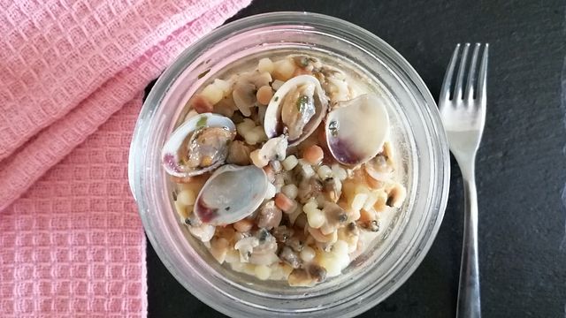 Ora prendete i vasetti che devono essere ben lavati, metteteci dentro la fregola e le vongole, poi unite il composto di olio aromatizzato e mescolate bene.