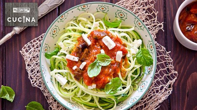 Preparate gli spaghetti "temperando" le zucchine con l'apposito attrezzo da cucina (in alternativa potete affettarle sottilissime e poi tagliarle a listarelle).