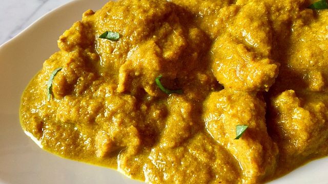 Fate rosolare dolcemente, poi alzate la fiamma, versate curry e noce moscata, mescolate, aggiungete 100 ml di brodo e continuate la cottura su fiamma bassa per almeno una decina di minuti.