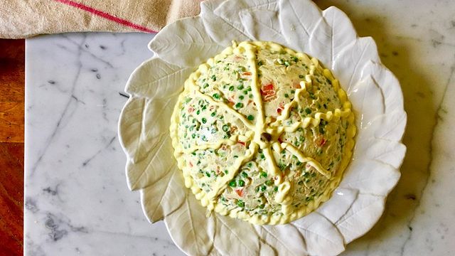 Per dare all’insalata russa la forma a cupola, rivestite uno stampo con pellicola, riempite con l’insalata, riponete in frigorifero fino al momento di servire.