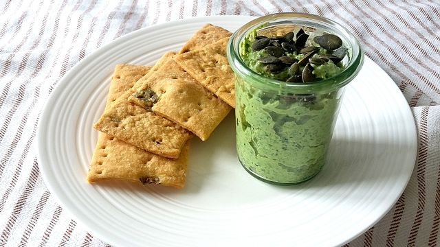 Questo pesto ha un gusto fresco ed una consistenza cremosa e rustica che si abbina bene alle verdure, ai cracker e ai nachos.