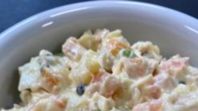 Sgranate 200 grammi di pisellini freschi e cuoceteli in acqua bollente lasciandoli croccanti. Fate 2 uova sode, da quando l'acqua bolle calcolate 9 minuti. Tagliate a dadini 350 grammi di patate, 250 grammi di carote e cuocetele a vapore. Basteranno 10 minuti. Preparate la maionese con 3 tuorli, 1 cucchiaino di aceto di vino bianco.