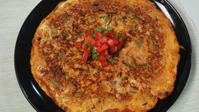Rosolate in olio evo la cipolla, aggiungete la polpa di pomodoro e i fagiolini surgelati. Salate e controllate la cottura dei fagiolini. Nel frattempo sbattete leggermente le uova per ottenere poi una frittata consistente.