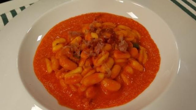 Tagliate lo speck a listarelle e fatelo rosolare in una padella antiaderente fino a renderlo croccante. Cuocete i cavatelli in abbondante acqua salata per 5 minuti circa e scolateli. In una padella antiaderente versate la salsa di peperoni, quindi aggiungete metà dello speck , i capperi, la pasta e mescolate con cura. Per servire, versate la crema di peperoni nei piatti, sopra la pasta e infine guarnite con lo speck restante.