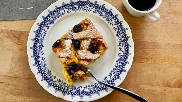 Fate cuocere la Crostata con crema pasticcera e amarene in forno statico a 180°C per circa 35-40 minuti.