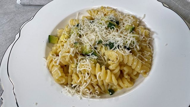 Tagliate due zucchine a dadini e mettetele poi in padella con olio Evo e 1 spicchio di aglio. Rosolatele a fuoco vivace. Aggiungete del sale e completate la cottura. Aprite 6 uova e sbattetele con sale, pepe e abbondante formaggio grattugiato. Diluite leggermente con l'acqua di cottura.