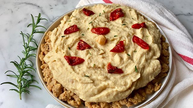 Base croccante di sbrisolona salata preparata con farina integrale, formaggio grattugiato e rosmarino tritato. Crema di ceci al naturale, senza uova, che non ha bisogno di cottura. Quando la base è pronta si versa la crema a cucchiaiate partendo dal centro e stendendola verso i bordi. Potete decorare con pomodorini confit oppure con olive verdi e nere tagliate a fettine. Servitela come antipasto o piatto unico accompagnata da un contorno. Fresca e leggera, perfetta per una tavola conviviale.