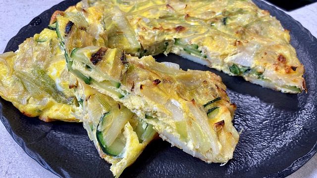Ripassate le patate in padella con olio Evo e fate formare una crosticina. Togliete l'olio in eccesso e salate. Sbattete 6 uova con 30 grammi di formaggio grattugiato e un po' di latte. Mettete della carta forno in una tortiera, disponete le patate,le zucchine, i cipollotti e infine le uova. Fate cuocere a 180 gradi per 20 minuti.