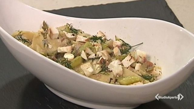 Ottenete dei maltagliati e metteteli direttamente nel condimento aggiungendo del finocchietto selvatico. Sfumate con la birra. Fate cuocere per 8 minuti. Aggiungete due dita di acqua calda sopra il livello della pasta. Dopo aver tolto la ricotta dal forno e averla fatta raffreddare, tagliatela a cubetti e aggiungetela direttamente in padella con la pasta. Impiattate ultimando con un giro di pepe.