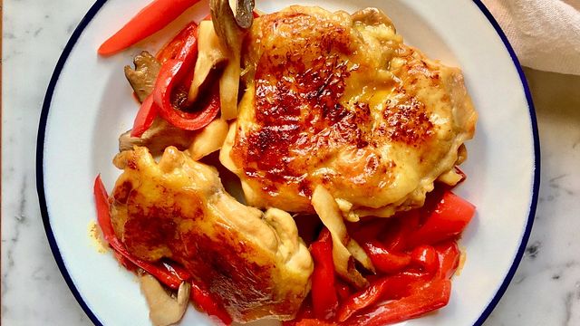 Rimuovete le verdure e il pollo dal tegame, rigirandolo e servendolo dal lato della pelle che sarà lucida e croccante mentre la carne sarà saporita e succosa.