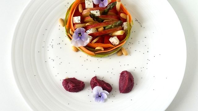 Disponete in un piatto piano le strisce di asparagi e carote creando un nido, aggiungete sopra la valeriana, i pomodorini, le fette di mela sgocciolate ed il brie a cubetti.