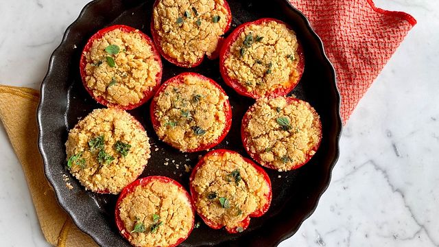 Un contorno estivo che, nella sua semplicità, è perfetto. Questa ricetta è una versione “alla romagnola” e della mia famiglia. Il ripieno è fatto solo con pangrattato e un pugno di erbe profumate che puoi mescolare tra loro o sceglierne una tra origano, rosmarino, prezzemolo. L’importante è tritarle molto finemente. Durante la cottura in forno avviene la magia. Il ripieno di pangrattato forma una crosticina croccante che mantiene morbida la polpa del pomodoro. Per ringraziare della protezione, il pomodoro trasferisce il suo sapore al pane che sotto resta umido e gustoso. Da sempre calcolo 1 pomodoro a testa ma, se sono piccoli, preparatene di più.