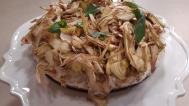 Battete sul tagliere per eliminare l'aria, mettete nuovamente in frigorifero e lasciate 20 minuti in modo che si rapprenda bene anche il formaggio. Tagliate poi sottilmente i carciofi e condite con succo di limone, pepe, sale e olio. Distribuite sulla base, aggiungete del pepe rosa per ingentilire il gusto e rimettete in frigo ancora per 30 minuti.
